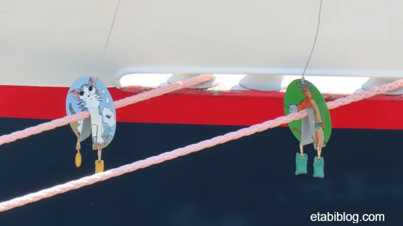 今まで何度もクルーズ船を出迎えています。今回初めてネズミ返しを見つけました。陸から船にネズミの侵入を防ぐ装置です。