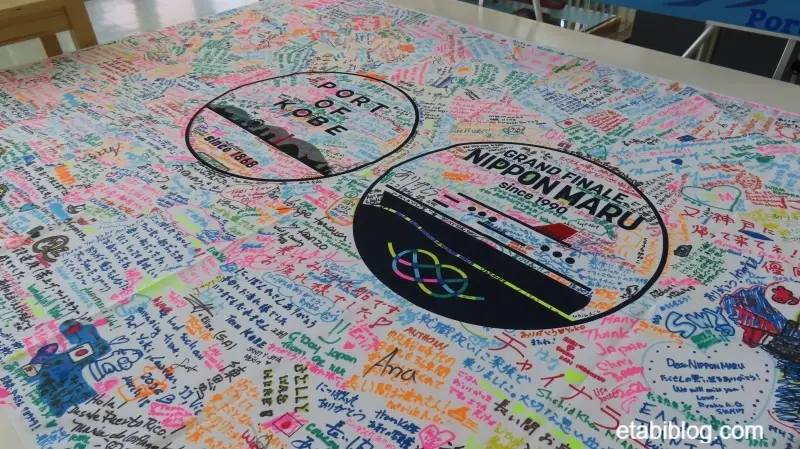 「にっぽん丸」の引退に寄せて、市民の皆様からメッセージを書いていただく横断幕が用意されています。