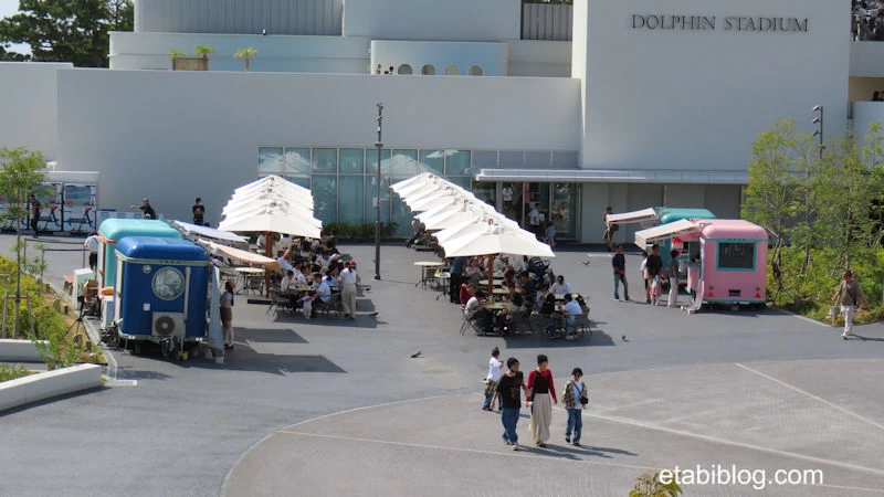 もう一カ所は、ドルフィンスタジアム前に両サイドに分かれて並んでいます。屋根付テーブルが使い易くなりました。