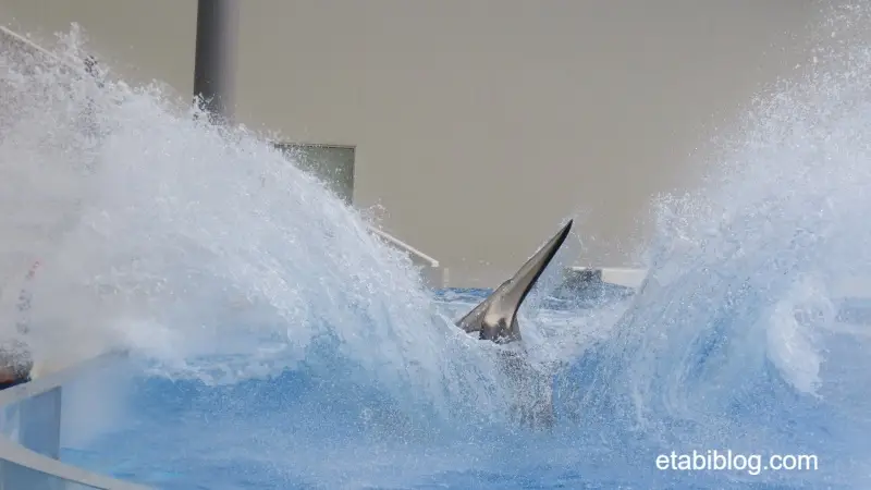 巨大なシャチが空中で1回転してプールに落ちる瞬間の水しぶきは、何度見ても圧巻です。