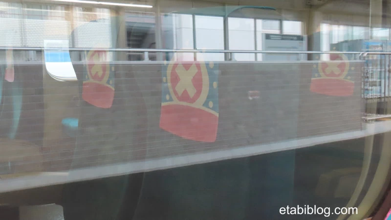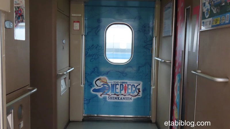 新幹線車内の、出入り口ドア内側と、座席車内ドアにも、チョッパー-やワンピースのイラストがあります。